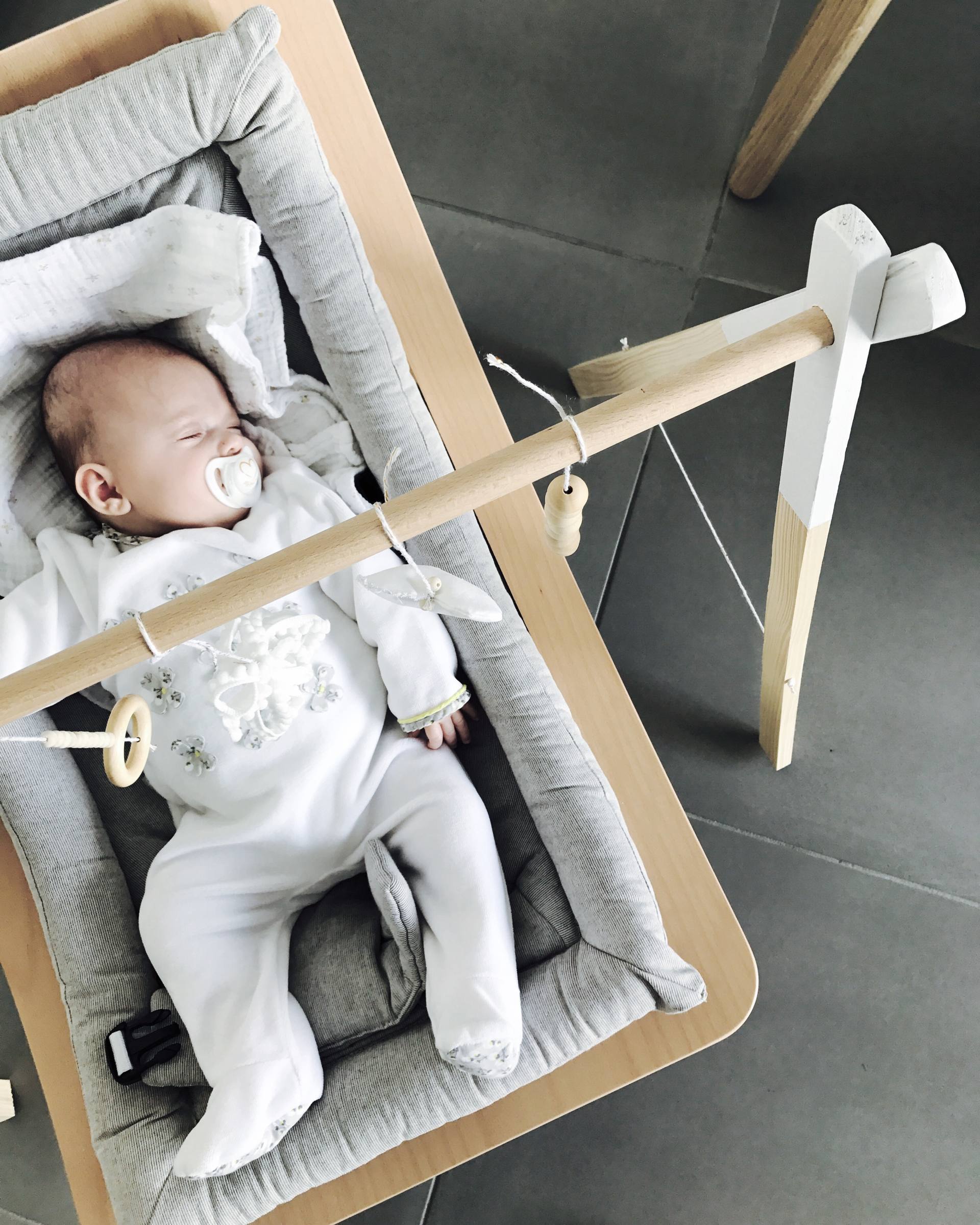 Pour le transat, on savait que ce serait notre article de puériculture qui resterait vraiment toujours dans le salon. Du coup, je voulais absolument qu’il soit joli ! J’avais repéré le transat Levo de Charlie Crane sur Instagram et c’est finalement celui que Louise a eu. Non seulement il est super mignon, mais en plus, il s’accorde parfaitement dans la déco du salon. Il est très confortable, Louise y était très bien dedans car il était tout molletonné. Ce qu’elle aimait bien, c’était le fait d’être un peu relevée pour voir ce qu’il se passe. Pour moi, c’était top car allongée, Louise avait toujours tendance à mettre sa tête du même côté. Alors que dans le transat, elle l’avait droite. On peut bien l’attacher aussi. Au début, ce n’était pas utile puis c’est devenu obligatoire, mais c’est généralement le moment où on arrête de s’en servir. Globalement, je favorisais le temps passé au sol ou dans mes bras car c’est plus favorable à l’éveil, mais toutes les alternatives sont bonne pour varier les sensations, les positions, les angles de vues. Je pense que tout favorise l’éveil !