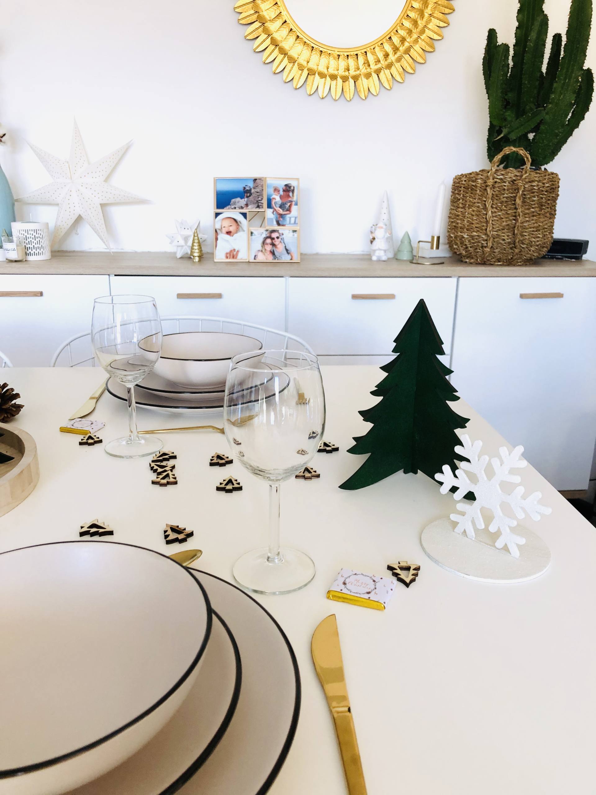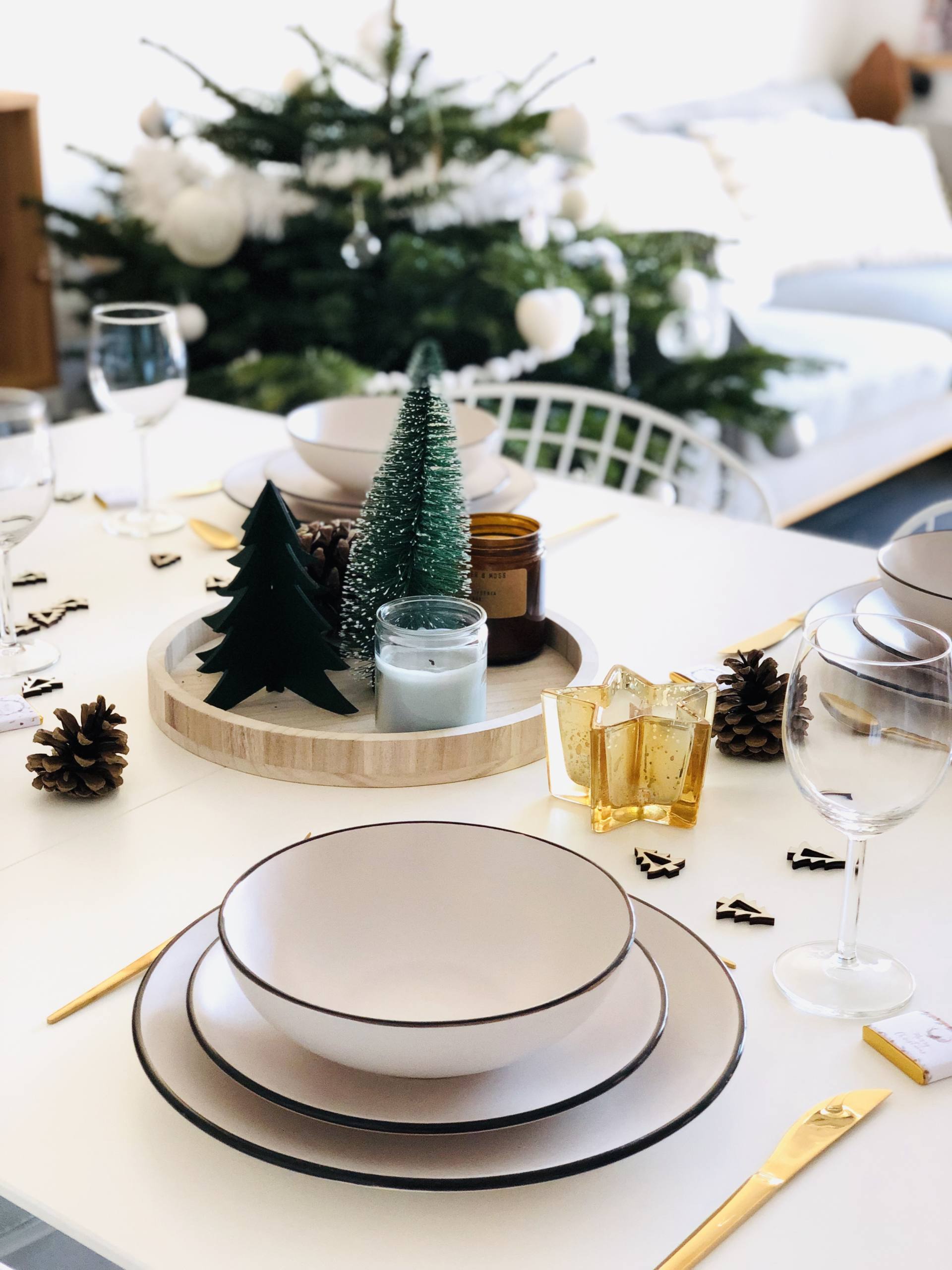 Avant le jour J, j’ai dressé toute ma table de réveillon de Noël pour faire la photo du concours Conforama. C’était aussi l’occasion pour moi de faire un test et de voir ce que ça donnait ! Finalement, ce sera simple, sobre, du blanc, du bois, des touches de noir dans la vaisselle, du vert sapin, des pointes de doré. Ça correspond plutôt bien à notre appartement en fait ! Il ne me manque plus qu’à trouver quelques autres pommes de pain et à découper 2-3 branches à l’arrière de mon sapin pour la table. Je me suis dit que j’allais vous partager tout cela dans un article, ça vous donnera peut-être des petites idées de dernière minute. Les sapins verts, pommes de pin, petites pièces en bois, bougie dorée, figurines en bois et petits chocolats sont issus de la box de Noël Oh My Confetti. C’est un concept de box d’anniversaire personnalisée que j’aime beaucoup et dont je vous avais parlé ici pour l’anniversaire de Louise. Cette année, elles ont aussi fait des boxs de Noël dont je vous avais parlé début décembre ! Et bien sûr, on a la petite création de Noël de Louise faite à la crèche qui trônera fièrement sur la table, parce que franchement, je trouve que l’idée est top et que c’est bien utilisable !
