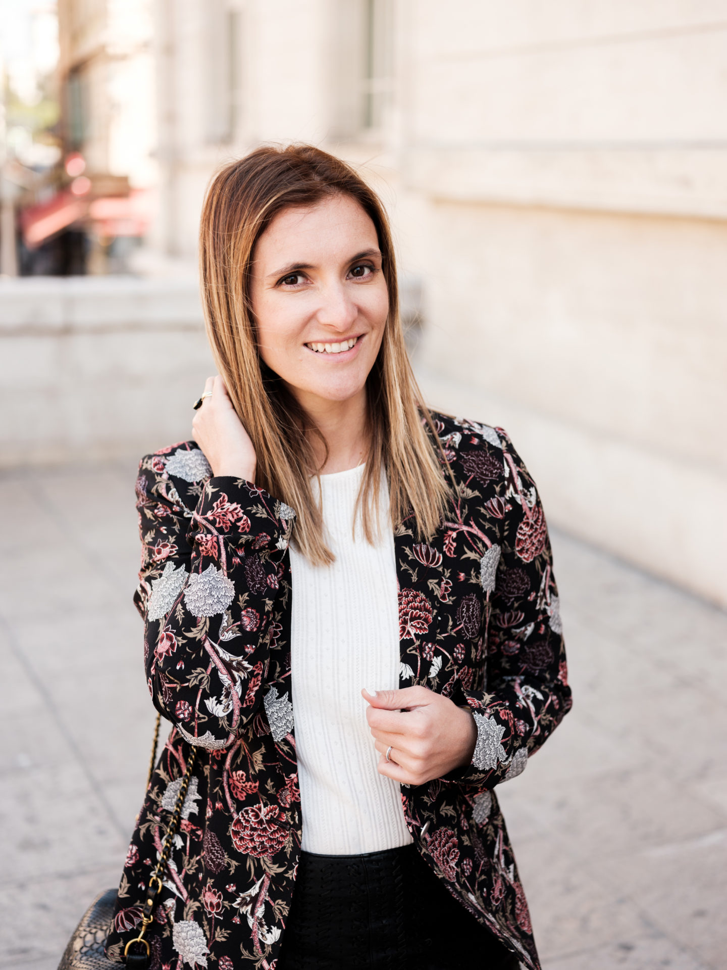 Pour ce premier look gambettes à l’air, c’est un look jour ou soir, comme vous voulez. Moi, je le porte plutôt pour aller manger des tapas ou faire un apéro avec une copine. J’ai associé cette jupe à mon tee-shirt favori de la saison, j’ai nommé le Cléo de chez Sézane. Il est confortable, la matière est agréable, il est simple mais bien coupé, et j’adore les détails sur les bras. Je le porte très souvent, avec un jean, une jupe, un short, il va vraiment avec tout. Il tient un poil chaud peut-être pour le plein été, mais là, pour une look de soirée, c’est parfait. J’ai eu un coup de coeur pour cette veste en début de saison, le motif est magnifique, elle est plutôt fluide et légère. Et à la fois, elle est très bien coupée et a un super tombé, ce qui n’est pas toujours le cas des pièces fluides.