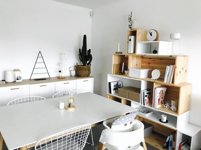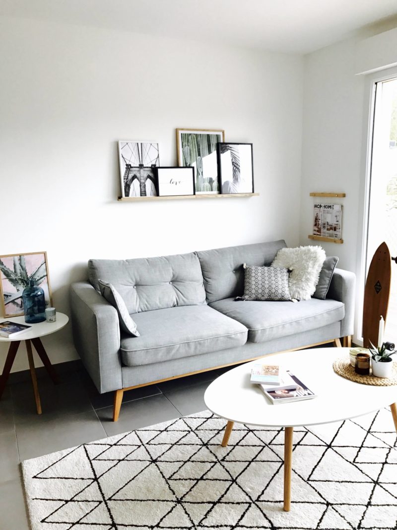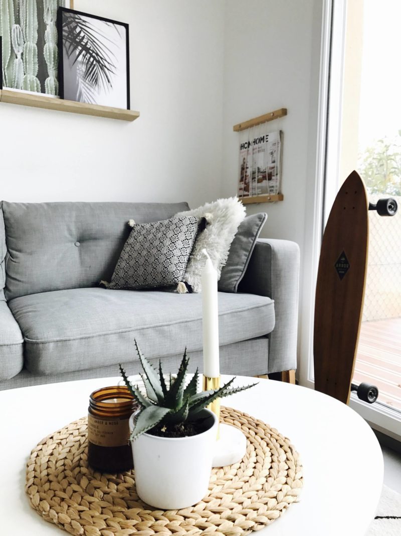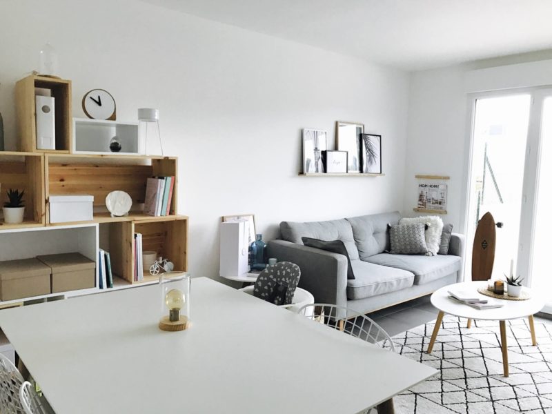 Une fois arrivée, c’était un tel chamboulement, on l’attendait qu’un mois plus tard cette poupée ! Du coup, on a géré au quotidien. Acheter des vêtements de naissance, des couches, des pyjamas de toute petite taille. Faire les e-shops pour shopper ce qu’on avait repéré. Autant vous dire qu’on a relégué l’appartement au second plan. Fin janvier est vite arrivé et Steph est retourné travailler. Il a attaqué par un déplacement de 4 jours qui a été pour moi synonyme de 3 nuits blanches. Louise a eu peu de coliques mais elle en a eu ces trois nuits-là. Vous imaginez bien qu’à ce moment-là, la décoration était le dernier de mes soucis ! Puis finalement, on s’y est remis tardivement. On a profité de Louise, on a fait sa chambre en premier. Le temps a été venu de retourner travailler, puis de quitter mon job, puis de travailler pour vous. Beaucoup de changements en milieu d’année. L’été est arrivé, on en a profité, on est parti en weekend, en vacances. Même si avec un bébé, on est beaucoup plus souvent chez nous qu’avant, on ne se souciait pas trop de l’appartement une fois que le plus gros a été fait. Puis, on a traîné ! Mais au bout d’un moment, on s’est dit que quand même, il fallait s’y remettre ! A l’automne quoi. Oui, on est là depuis presque un an. Mieux vaut tard que jamais non ? Je vous avais dit que je ferai des roomtours. J’ai pas oublié mais ils seront arrivés tardivement. La pièce à vivre, c’est l’endroit que vous voyez le plus souvent dans mes stories (par petits bouts) et j’ai souvent plein de questions. D’où vient ma table basse, ma table à manger, mes meubles ou autres. Je vous avais quand même fait un article sur mon meuble fait par moi-même avec les modules La Redoute (ici).