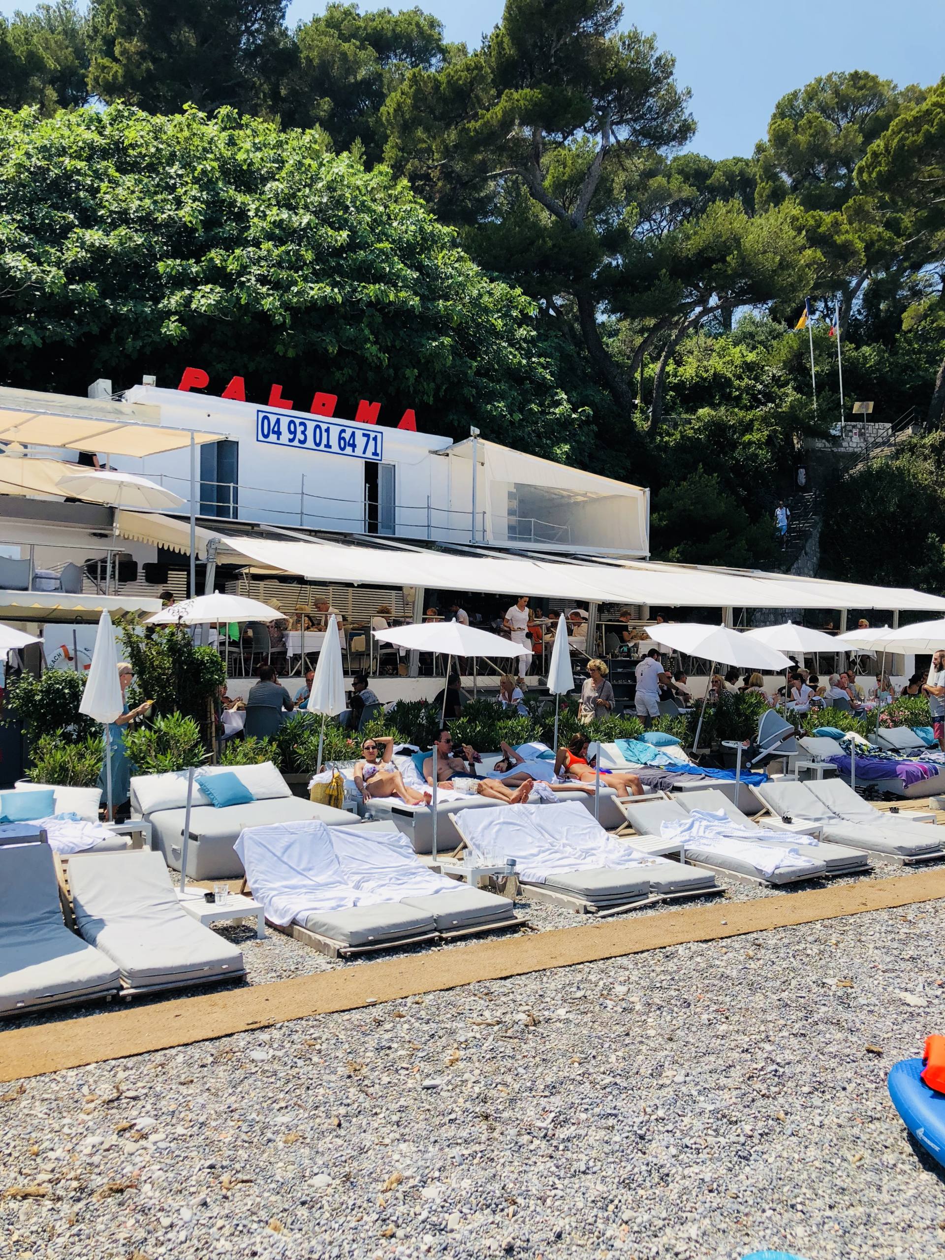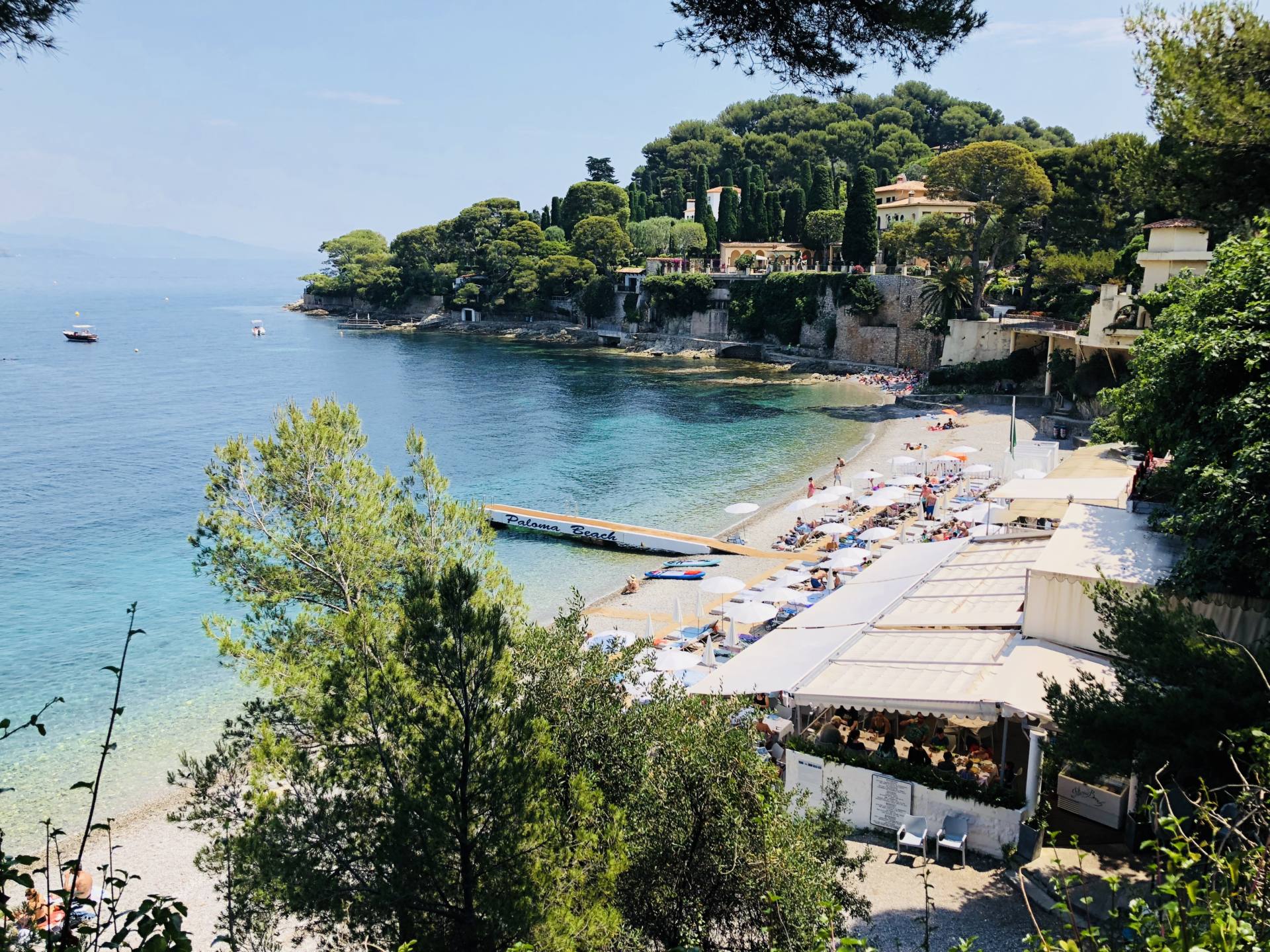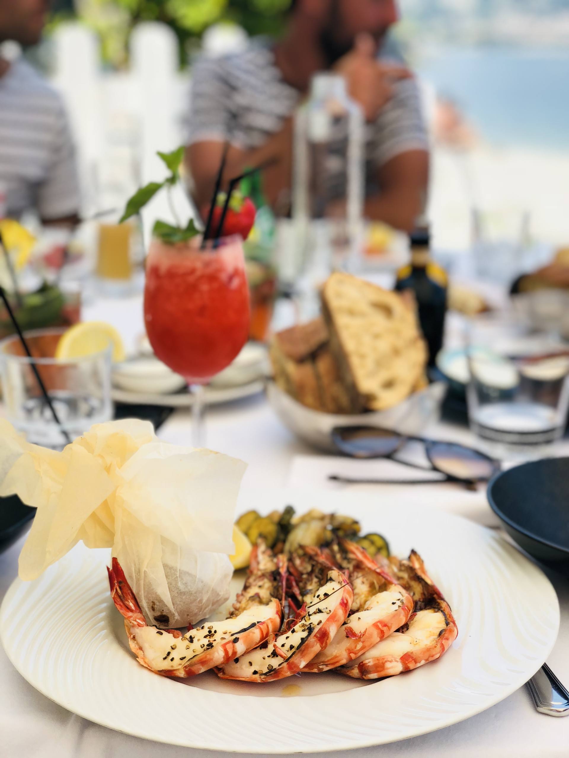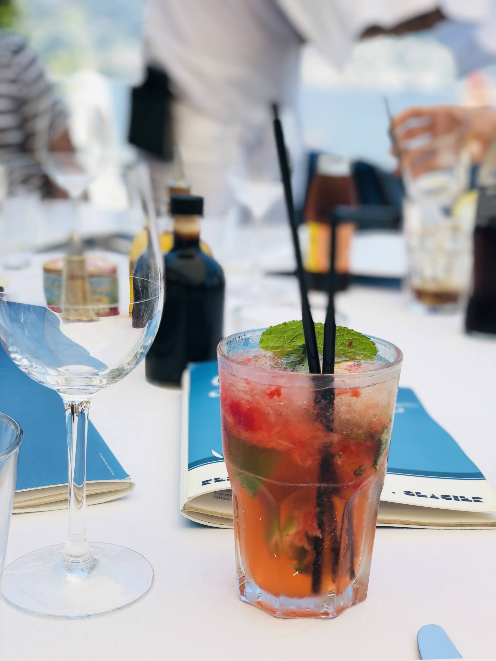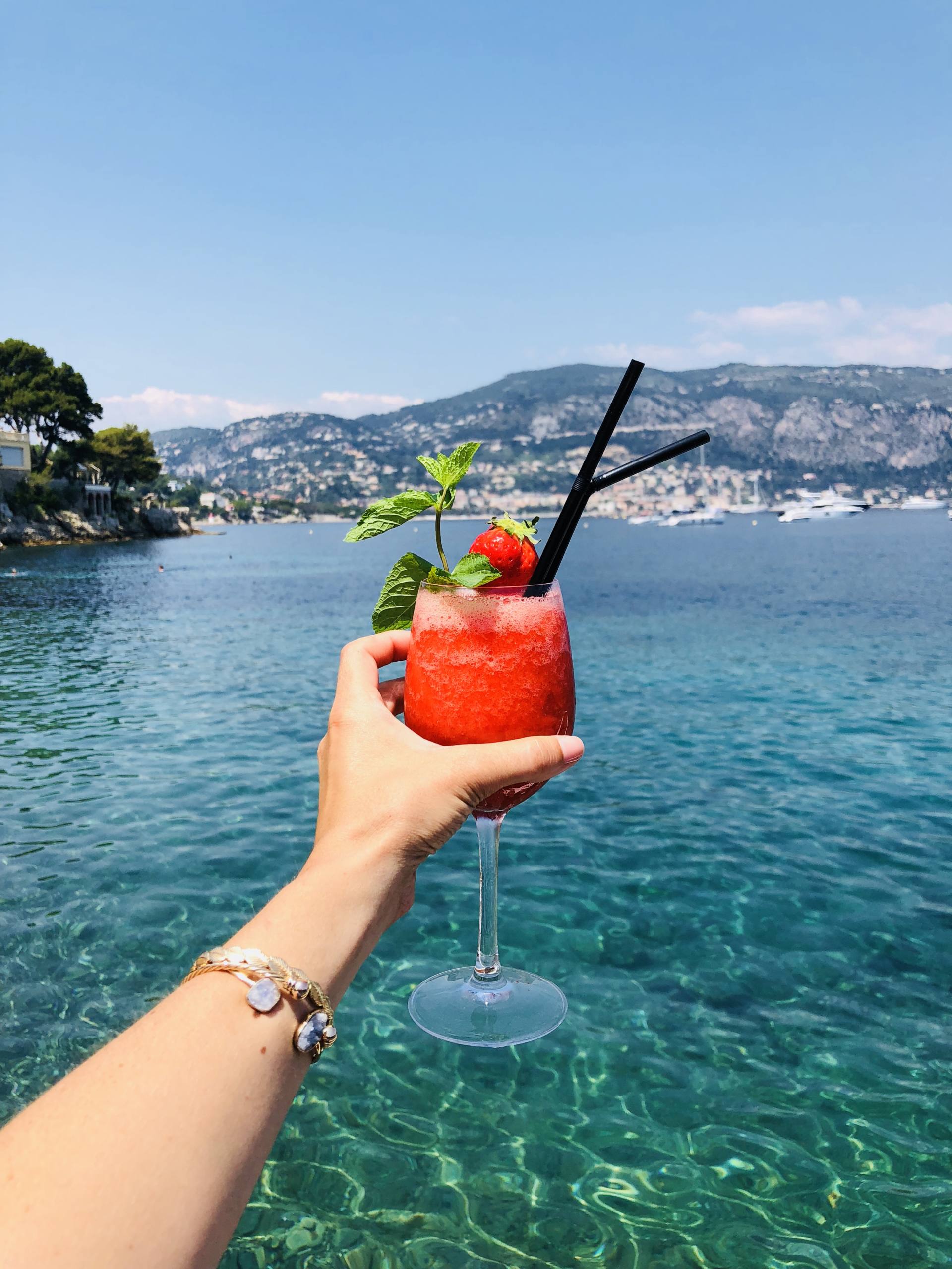 On a eu de la chance, il a fait super beau pile sur le créneau prévu ! On est directement parti direction Saint Jean Cap Ferrat. C’est fou comme ça va vite en bateau ! On a longé le littoral et quel régal de voir Villefranche sur Mer depuis la rade. C’est pour moi un des plus beaux villages de la Côte d’Azur. Des couleurs, du relief, une vieille ville et un petit port, c’est sublime. Sans parler de cette rade qui est magnifique. C’est juste dommage qu’il y ait régulièrement de gros ferries ! Ensuite, on a contourné le cap et on a pu apercevoir deux petites anses abritant de jolies plages ! L’eau était vraiment turquoise et cristalline, incroyable ! On est allé un peu plus loin, sur le Port de Saint Jean Cap Ferrat. On avait prévu se déjeuner à Paloma Beach. Ça fait des lustres que j’avais envie d’y aller mais l’occasion ne s’est jamais vraiment présentée. En arrivant par la route, la plage est en contrebas, sur une plage pas très grande. Un spot plutôt intimiste ! Évidemment, le cocktail s’imposait, et depuis peu, je fais des infidélités aux mojitos pour des daïquiris ! Cette fois-ci, c’était un Daïquiri Fraise, et c’est trop bon ! Côté food, le poisson, c’est leur spécialité, donc j’ai pris des sortes de mini-langoustines, servies avec une pomme au four et des petits légumes, un régal ! La vue est à tomber et la couleur de l’eau superbe !